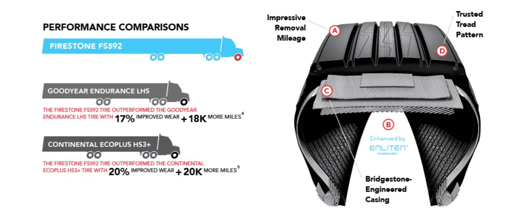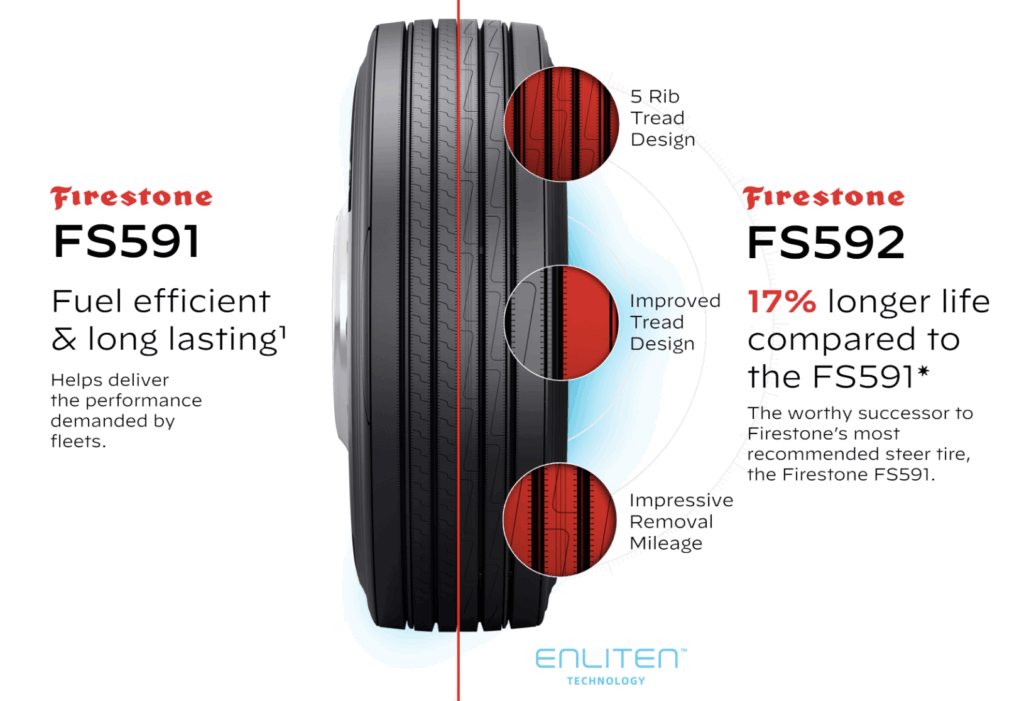 Bridgestone Americas đã giới thiệu lốp lái Firestone FS592 dành cho các đội xe tải đường dài và liên tỉnh. Lốp xe tải hạng nặng “lắp đặt và quên đi” mới này bổ sung thêm 0,32 inch chiều sâu gai lốp và diện tích tiếp xúc lốp rộng hơn, cho phép di chuyển quãng đường dài hơn so với thế hệ trước, đồng thời vẫn duy trì hoa lốp bền bỉ, đã được kiểm chứng, Bridgestone cho biết.