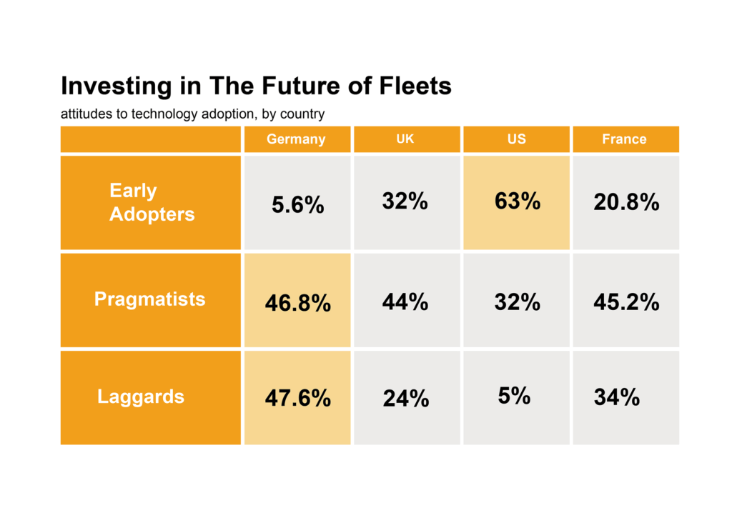 Những người được hỏi từ Đức ít cởi mở với sự thay đổi, mặc dù họ thường xuyên phàn nàn về áp lực chi phí và bất ổn kinh tế. Chỉ 51% nhà quản lý đội xe Đức coi việc chuyển đổi là cần thiết, và chỉ 22% lo ngại về khả năng cạnh tranh trong tương lai. Bên cạnh chi phí tăng cao, 58% coi việc điện khí hóa đội xe và 48% coi tình trạng thiếu tài xế là những thách thức lớn. 48% nhà quản lý đội xe Đức cũng tự coi mình là những người chậm trễ về công nghệ – nhiều hơn bất kỳ quốc gia nào khác được khảo sát. 47% cho biết họ là những người thực dụng, chỉ áp dụng công nghệ mới sau khi chúng đã được thử nghiệm và kiểm chứng.