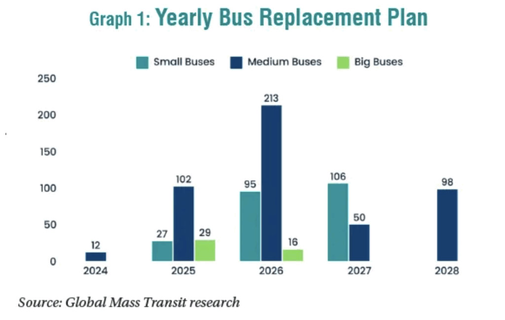Xe buýt nhỏ: Việc thay thế xe buýt nhỏ bắt đầu một cách khiêm tốn trong giai đoạn 2024–2025. Một sự gia tăng rõ rệt được ghi nhận vào các năm 2026–2027, phù hợp với chiến lược của thành phố nhằm triển khai xe nhỏ trên các tuyến hẹp hoặc mật độ dân cư thấp, tăng khả năng tiếp cận. Tập trung vào những năm sau cũng tạo điều kiện cho nâng cấp hạ tầng và đánh giá vận hành.