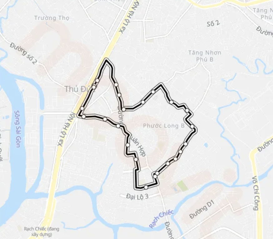 Bình Thái Bus Station → Right Frontage Road (Song Hành Phải) → Tây Hòa St. → Đỗ Xuân Hợp St. → Trần Đức Thảo St. → Street No. 1 → Street No. 15 → Avenue No. 2 → Street No. 18 → Street No. 9 → Đỗ Xuân Hợp St. → Dương Đình Hội St. → Street No. 22 → Tăng Nhơn Phú St. → Đỗ Xuân Hợp St. → Right Frontage Road → Bình Thái Bus Station.