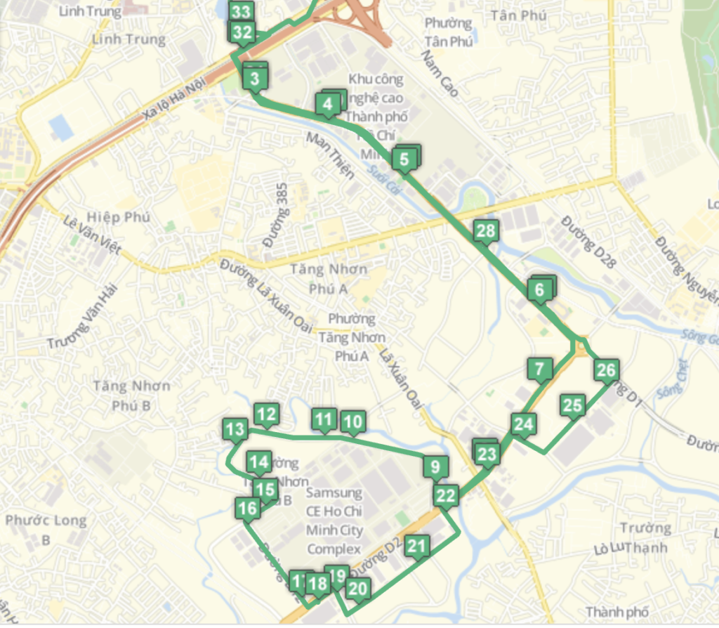 Nong Lam University Bus Station – National Highway 1 – Left Frontage Road – High-Tech Park Station – D1 Road – D2 Road – D14A Road – D14 Road – D15 Road (Section I) – D12 Road – D2 Road – D11B Road – D18 Road – D2 Road – D7 Road – D8 Road – D1 Road – Roundabout (intersection of D1 Road and N7 Road) – D1 Road – High-Tech Park Station – Left Frontage Road – 17th Street – Nong Lam Bus Station