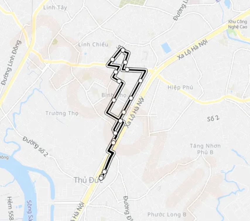 Banking University of Ho Chi Minh City – Street No. 17 – Hoang Dieu 2 Street – Le Van Chi Street – Vo Van Ngan Street (U-turn in front of Ho Chi Minh City University of Technology and Education) – Thong Nhat Street – Chu Van An Street – Nguyen Van Ba Street – (U-turn) – Thu Duc Station – Nguyen Van Ba Street – Nguyen Cong Tru Street – Thong Nhat Street – Vo Van Ngan Street – Chuong Duong Street – Street No. 17 – Banking University of Ho Chi Minh City